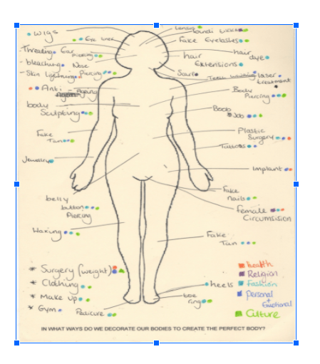 This sheet was entitled “In what ways do we decorate our bodies to create the perfect body?” We labelled the body with as many things as possible we could think of. These included permanent alterations including breast implants and nose jobs; temporary alterations including makeup and jewellery fake nails, clothing; cultural adornments including henna and bindis. Then we created a colour code to represent the words selected in exercise two and then place coloured dots next to the labelling words. Several different colours could be used for each word if appropriate.